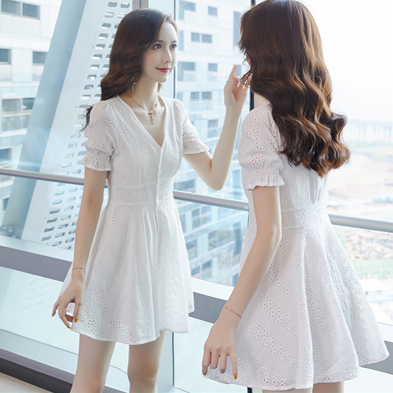 Women S Korean Style White Lacy Midi Dress Sweet Girls Prom Simply Plain Dresses Shopee Malaysia